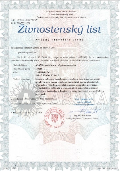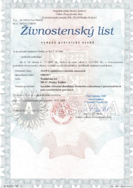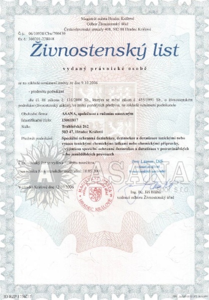 Předmět podnikání: Speciální ochranná dezinfekce, dezinsekce a deratizace toxickými nebo vysoce toxickými chemickými látkami nebo chemickými přípravky, s výjimkou speciální ochranné dezinsekce a deratizace v potravinářských nebo zemědělských provozech.