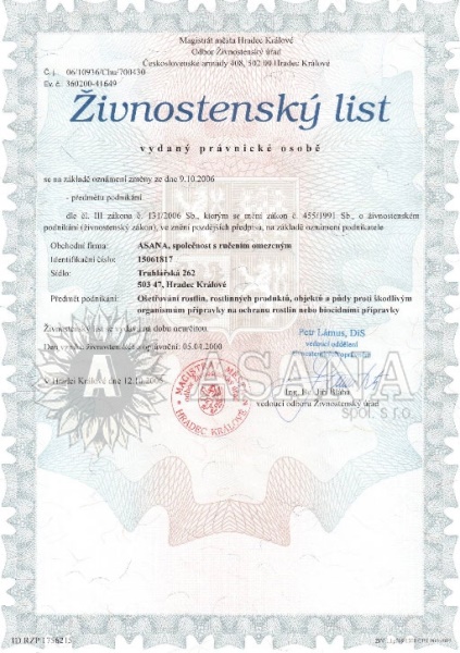 Předmět podnikání: Ošetřování rostlin, rostlinných produktů, objektů a půdy proti škodlivým organismům přípravky na ochranu rostlin nebo biocidními přípravky.